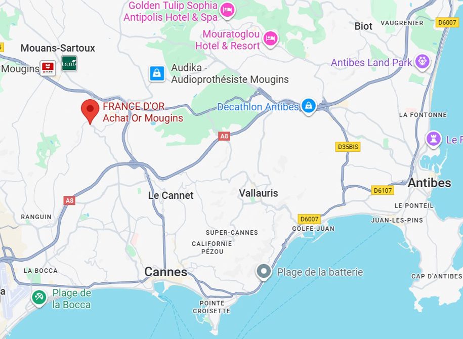 France D’Or Mougins vous accueille au 66 Av. de Tournamy du lundi au samedi pour vos projets d’achat vente or